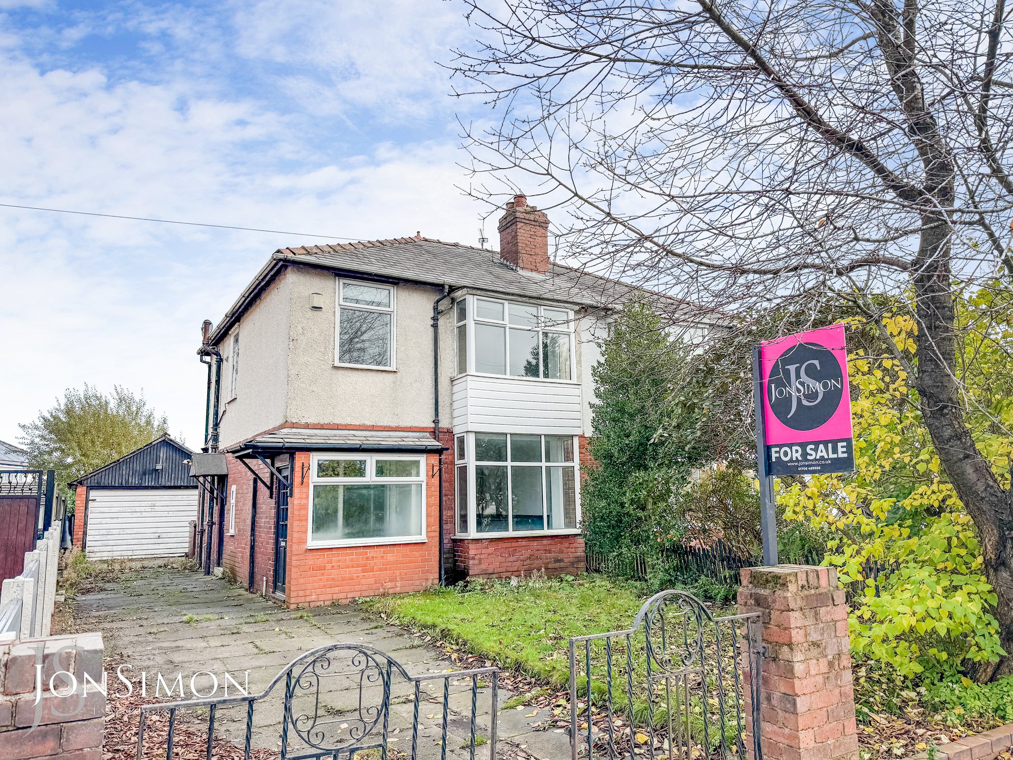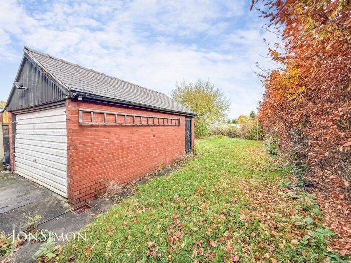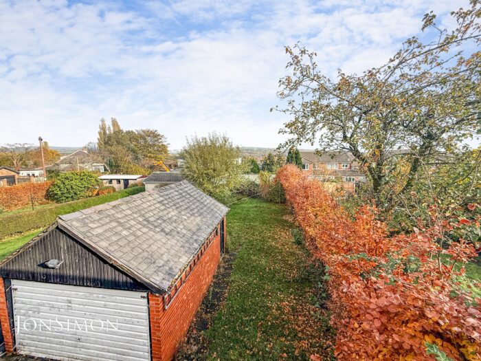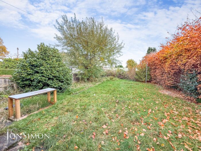 Front: Lawn area with border and shrubs, large flagged driveway for off-road parking.