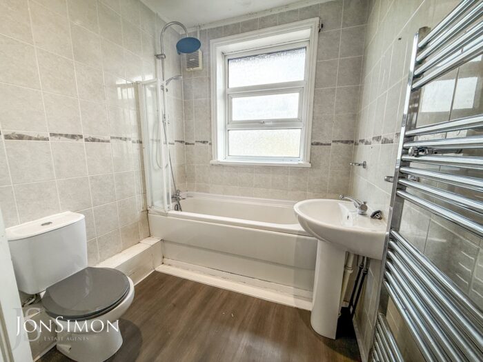 A three-piece white suite comprising of a panel bath with mixer tap, shower above WC, wash hand basin, storage cupboard housing the combi boiler, towel radiator, fully tiled walls, ceiling spotlights and UPVC double glazed rear window.