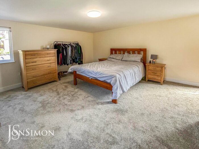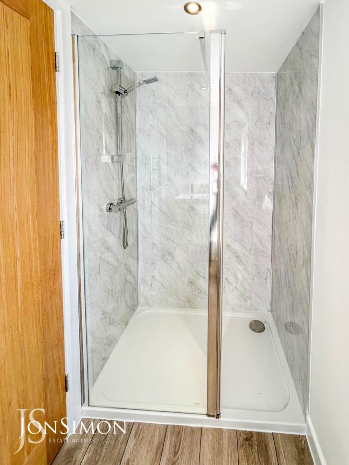 A modern three piece white suite comprising of a large walk-in shower unit, low level WC, wash and basin with storage cupboard underneath, chrome towel radiator, shave point, extractor unit, ceiling spotlights and UPVC double glazed side window.