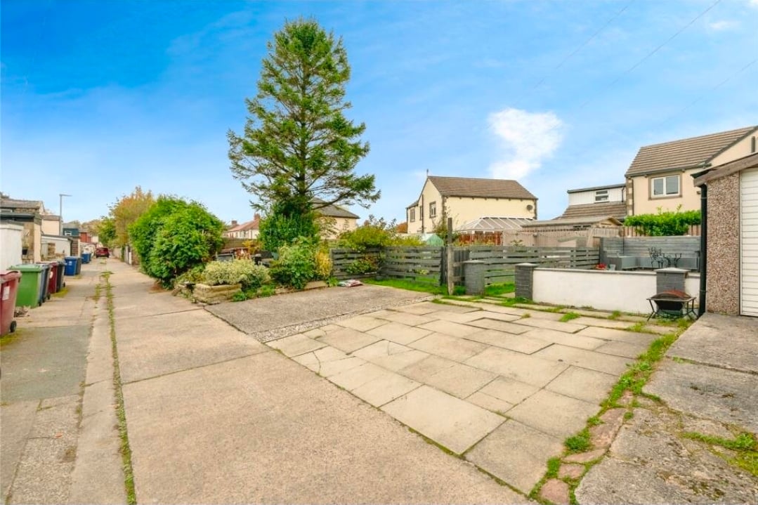 Located across the rear access road the rear garden boasts a laid lawn, enclosed panel fencing and a hard standing area currently used as off road parking.