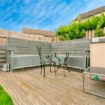 Externally, a gated forecourt to the front. To the rear, a flagged driveway and garden with decked seating area.