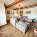 UPVC double glazed window, feature natural stone chimney breast, brick built fireplace, stone hearth, wood mantel, solid fuel burner, cast iron period radiator, beamed ceiling, half glazed oak door through to;