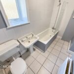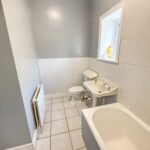 A three piece white suite comprising of a panel bath with shower above, low level w/c, wash hand basin, fully tiled walls, radiator, ceiling point, combi boiler and UPVC double glazed rear window.