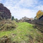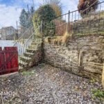 Enclosed rear flagged yard with stone steps to a lawn area.