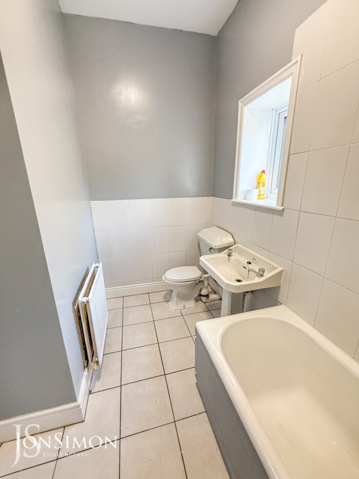 A three piece white suite comprising of a panel bath with shower above, low level w/c, wash hand basin, fully tiled walls, radiator, ceiling point, combi boiler and UPVC double glazed rear window.