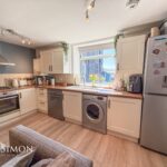Wall and base units with complementary worksurface, single bowl sink unit with drainer, four ring gas hob with extractor unit above, electric oven, plumbed for washing machine and dishwasher, part tiled walls, ceiling points and UPVC double glazed side window.