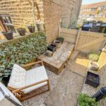 Gated access leading to a stone path, borders and shrubs. External lighting.