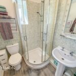 Three-piece white suite comprising of a shower unit, wash hand basin, low level WC, part tiled walls, radiator, extractor unit, ceiling point and UPVC double glazed side window.