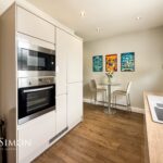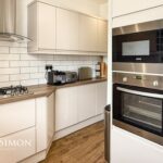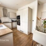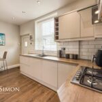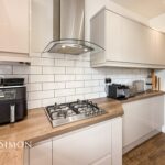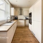 A modern fitted kitchen with a range of wall and base units with complimentary worksurface, one and a half bowl sink unit with drainer, four ring gas hob with extractor unit above, integrated microwave, fridge, freezer, washing machine and electric oven, part tiled walls, radiator, laminate flooring, ceiling spotlights, plumbed for dryer, UPVC double glaze rear window and UPVC double glazed back door.