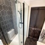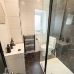 A three piece white suite comprising of a walk-in shower unit, low level WC, wash hand basin with storage cupboard underneath, towel radiator, fully tiled walls and flooring, extractor unit, ceiling spotlights and UPVC double glazed rear window.