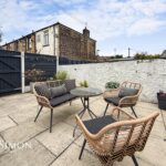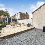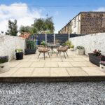A enclosed back yard, flagged patio area and pebbled area, bin area and gated access to the way.