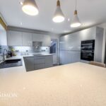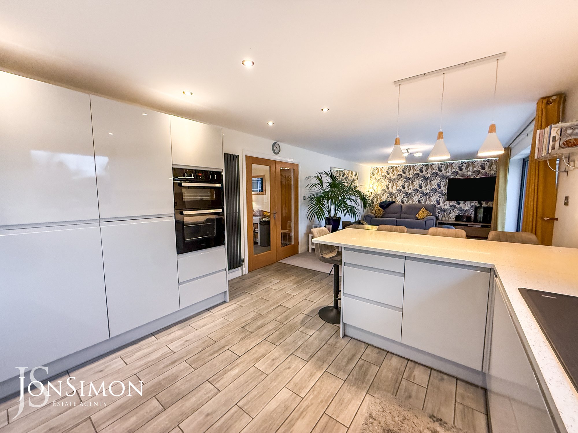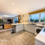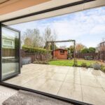 A contemporary fitted kitchen with a wide range of wall and base units with complementary white quartz worktops, one and a half bowl sink unit with drainer, integrated double electric oven, fridge, freezer and dishwasher, plumbed for washing machine, tiled flooring, four ring electric hob with extractor unit above, part tiled walls, breakfast bar, feature lighting, tiled flooring, radiator and ceiling spotlights. Aluminium Bi-Folding patio doors, radiators, TV point, ceiling coving and ceiling point.