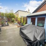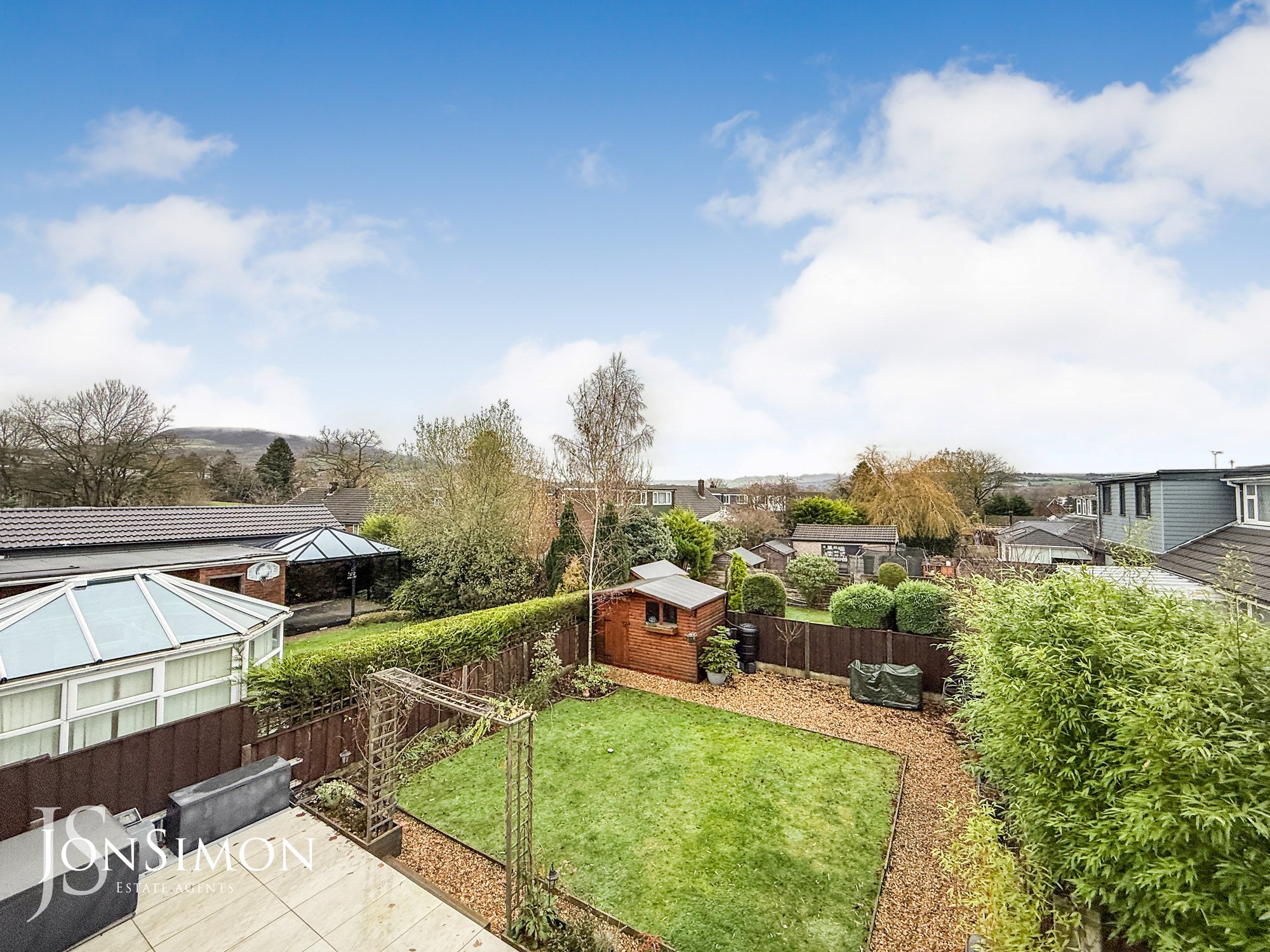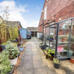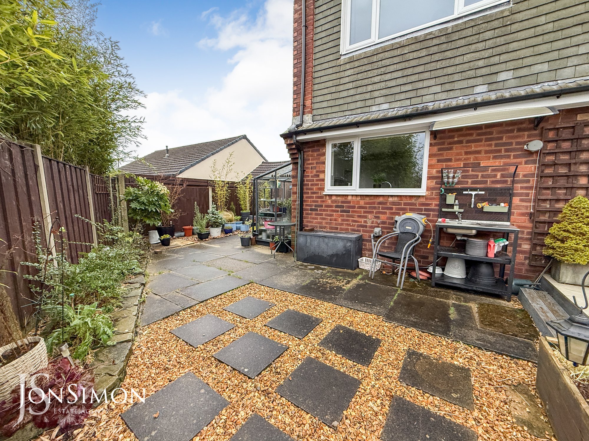 Side: Large flagged patio area, well established borders and shrubs, wooden shed, double wooden gates and side gate.