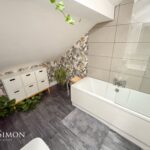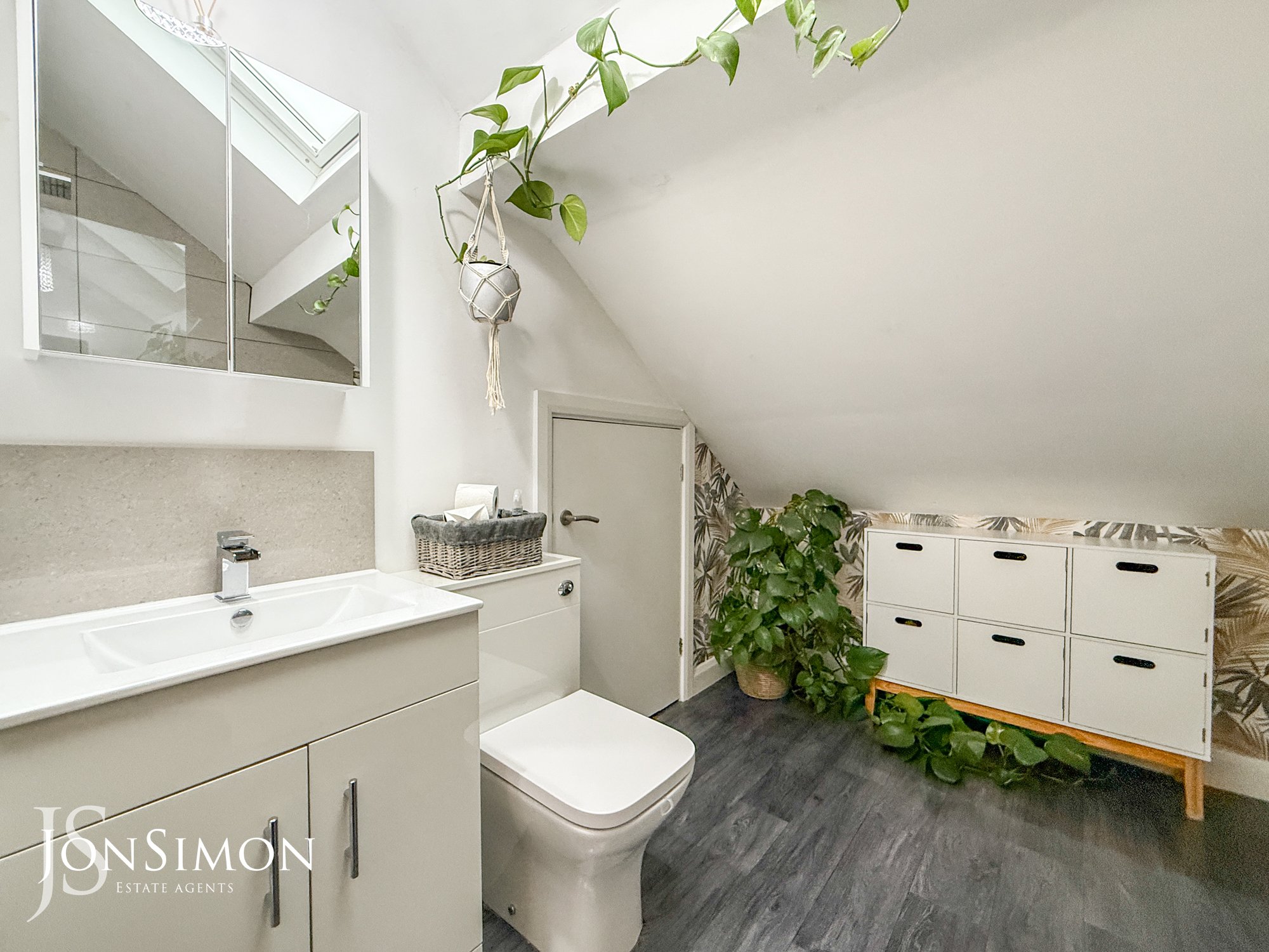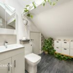 A modern three-piece white bathroom suite comprising of a panel bath with mixer tap, shower above, glass shower screen, low level WC, wash hand basin with storage cupboard underneath, chrome towel radiator, large storage cupboard into the eaves, part tiled walls, ceiling point and double glazed Velux window.