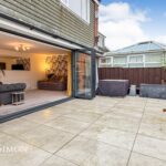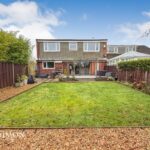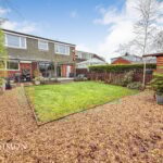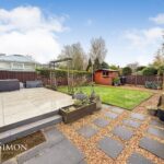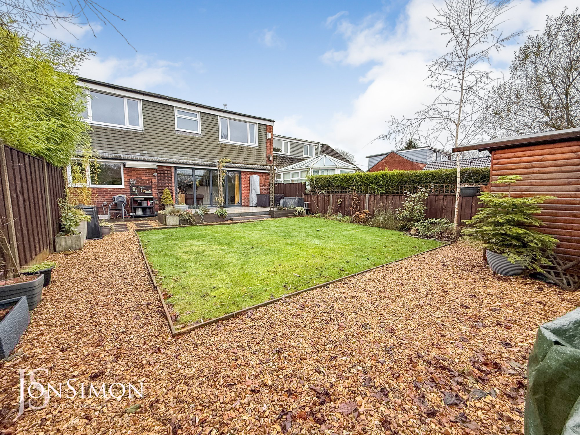 Rear: A large porcelain tiled patio area, well-maintained lawn area, well established borders and shrubs, pebbled borders, large wooden shed, water tap and fence panel surround.