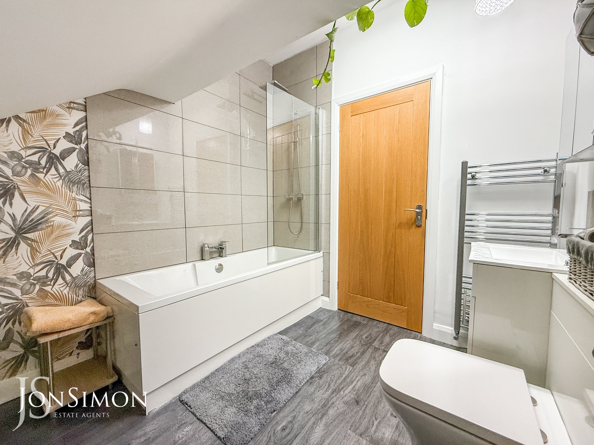 A modern two-piece white suite comprising of a low-level WC, wash hand basin, part tiled walls, chrome towel radiator, tiled flooring, extractor unit and ceiling point.