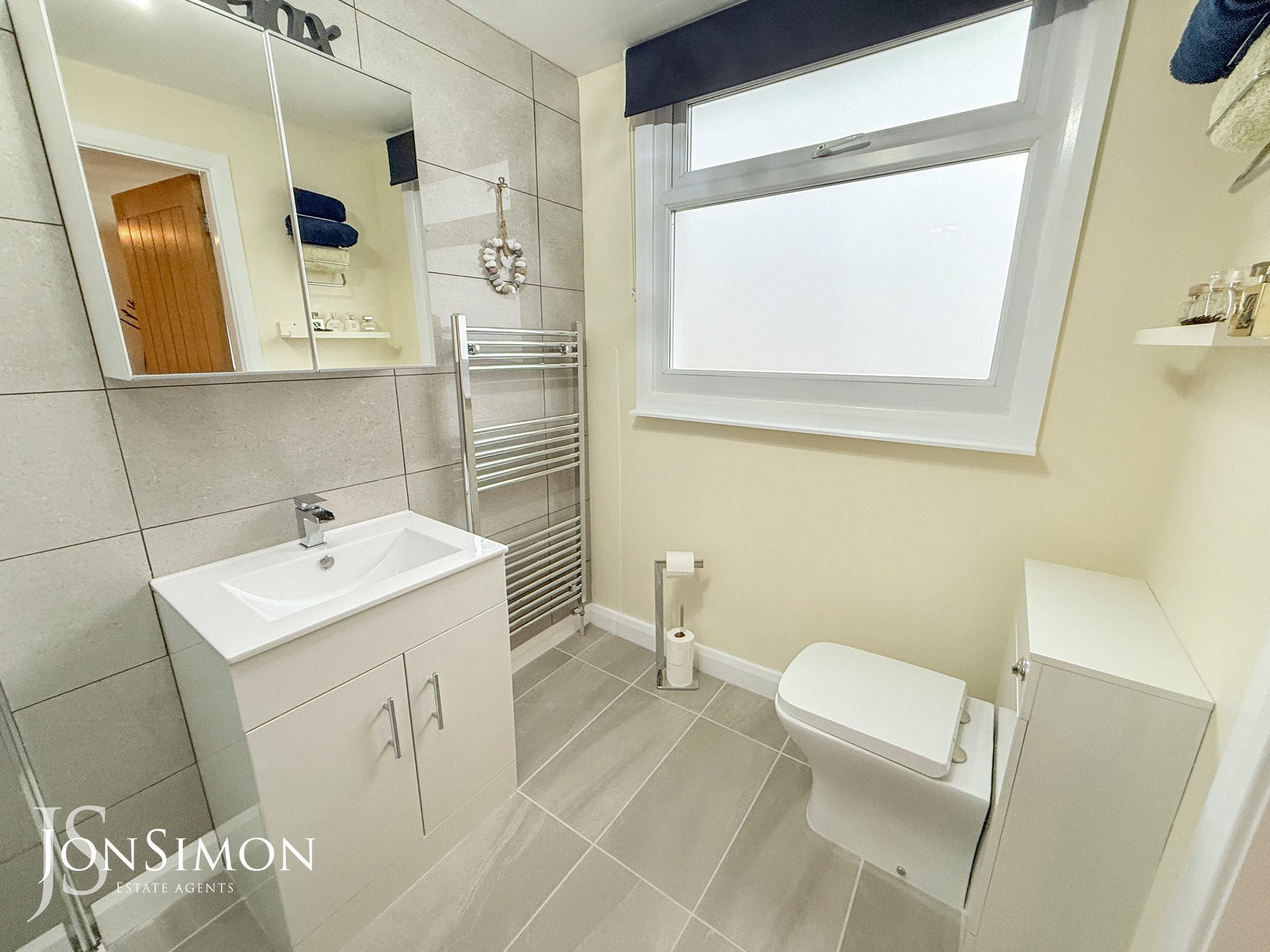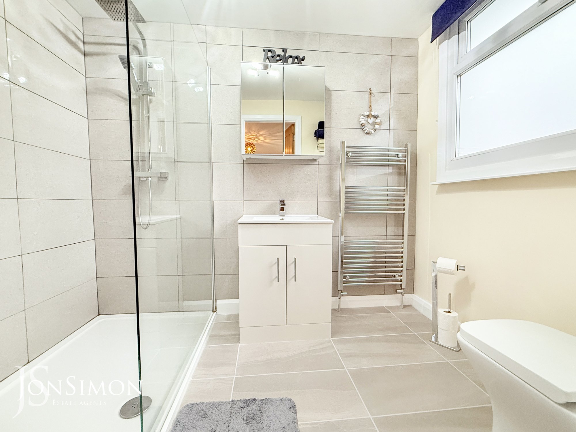 A modern three-piece white suite comprising of a large walk-in shower unit, low level WC, wash hand basin, storage cupboard underneath, chrome towel radiator, tiled walls, tiled flooring, ceiling point and UPVC double glazed rear window.