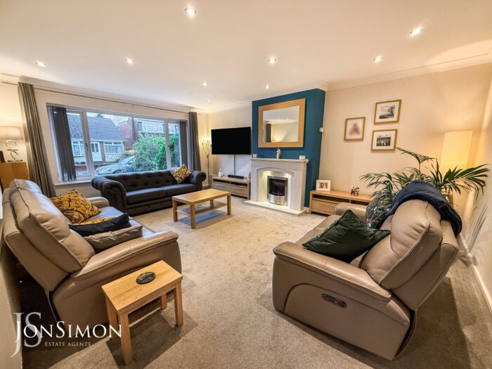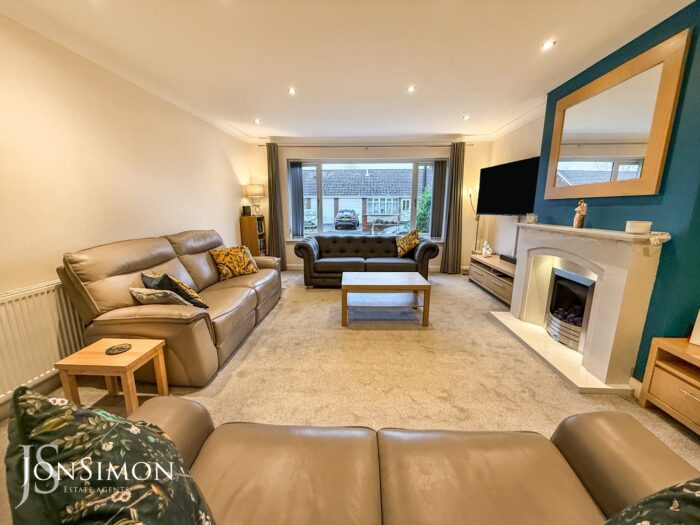 UPVC double glazed front window, feature coal effect gas fire with surround, TV point, radiator, ceiling coving and ceiling spotlights.