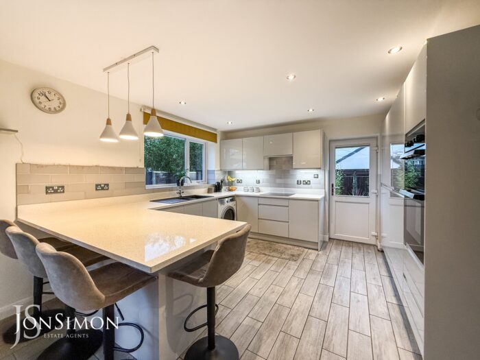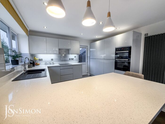 A contemporary fitted kitchen with a wide range of wall and base units with complementary white quartz worktops, one and a half bowl sink unit with drainer, integrated double electric oven, fridge, freezer and dishwasher, plumbed for washing machine, tiled flooring, four ring electric hob with extractor unit above, part tiled walls, breakfast bar, feature lighting, tiled flooring, radiator and ceiling spotlights. Aluminium Bi-Folding patio doors, radiators, TV point, ceiling coving and ceiling point.