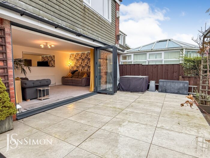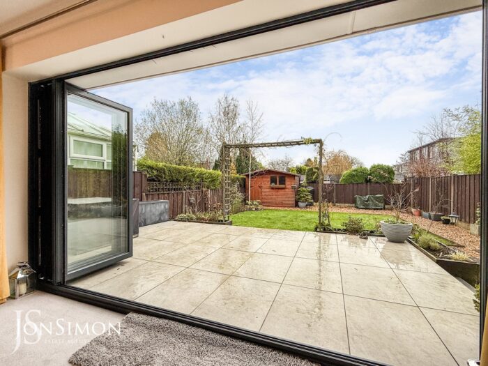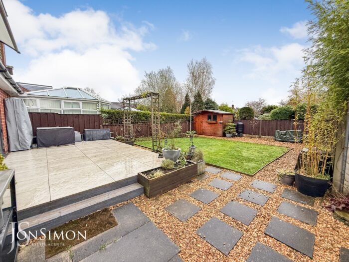 Rear: A large porcelain tiled patio area, well-maintained lawn area, well established borders and shrubs, pebbled borders, large wooden shed, water tap and fence panel surround.