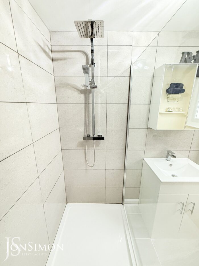 A modern three-piece white suite comprising of a large walk-in shower unit, low level WC, wash hand basin, storage cupboard underneath, chrome towel radiator, tiled walls, tiled flooring, ceiling point and UPVC double glazed rear window.