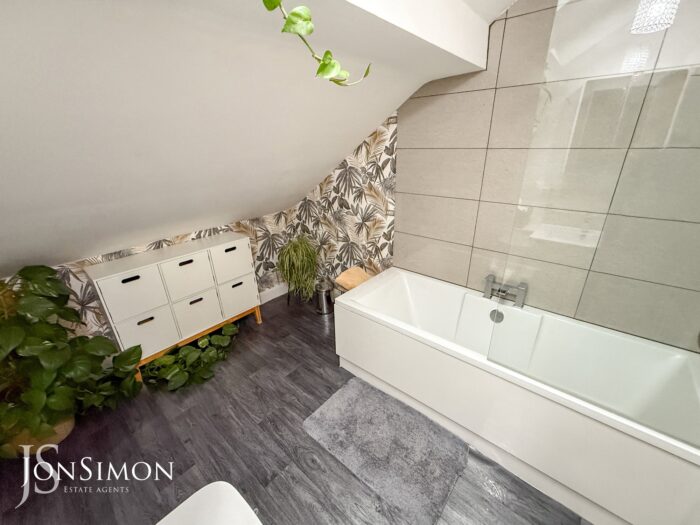 A modern three-piece white bathroom suite comprising of a panel bath with mixer tap, shower above, glass shower screen, low level WC, wash hand basin with storage cupboard underneath, chrome towel radiator, large storage cupboard into the eaves, part tiled walls, ceiling point and double glazed Velux window.