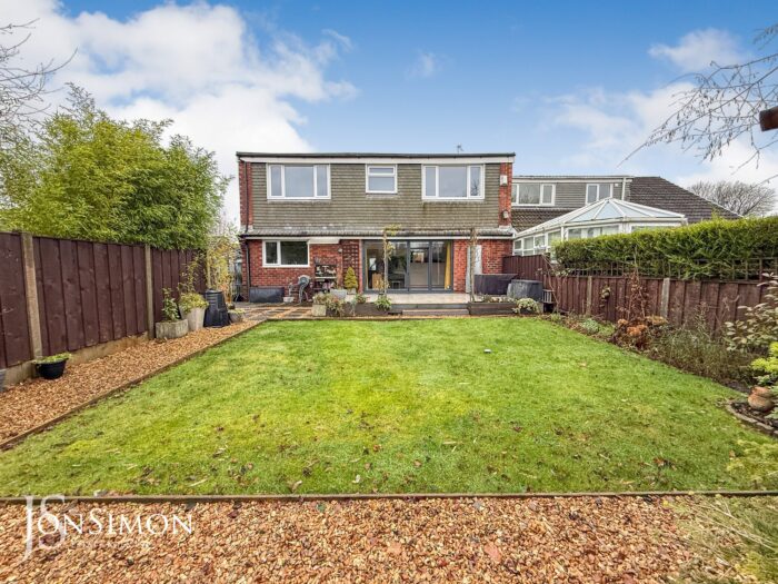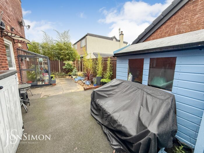 Side: Large flagged patio area, well established borders and shrubs, wooden shed, double wooden gates and side gate.