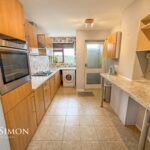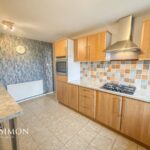 A modern range of wall units with complementary worksurface, single bowl sink unit with drainer, four ring gas hob with extractor unit above, electric oven, plumbed for washing machine, breakfast bar, radiator, part tiled walls, tiled flooring, ceiling points and double glazed rear window.