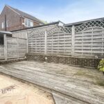 Front: A well maintained and low maintenance garden with paved patio area, lawn area, borders and shrubs, decked patio area, wooden shed, fence panel surround and gated access to the side.