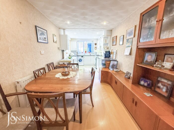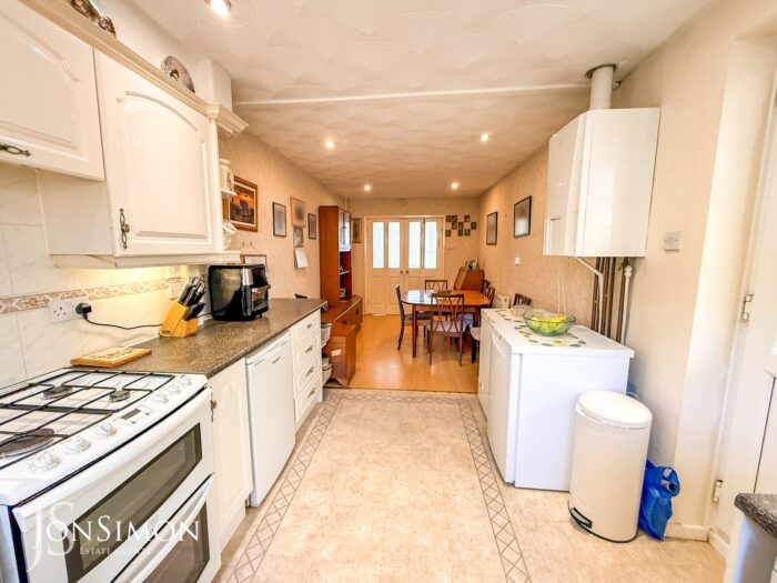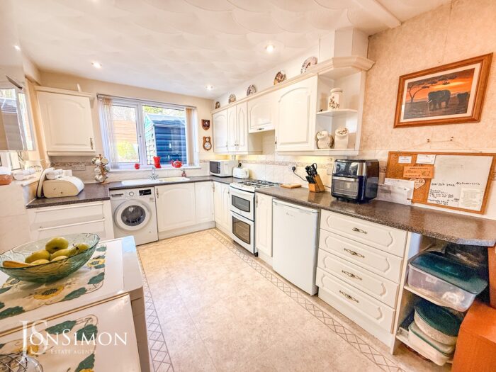 Range of wall and base unit with complementary worksurface, gas cooker with four ring gas hob, extractor unit above, single bowl sink unit with drainer, plumbed for washing machine and dryer, part tiled walls, Combi boiler, radiator, ceiling spotlights, laminate flooring, tile effect flooring UPVC double glazed rear and side windows.