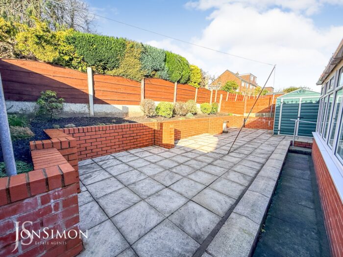 Rear: A low maintenance back garden with a large paved garden with borders and shrubs, outside water tap, gated access to the side and fence panel surround.
