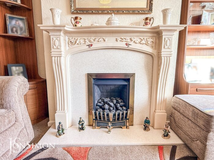 UPVC double glazed front window, coal effect gas fire with feature surround, radiator and ceiling point.
