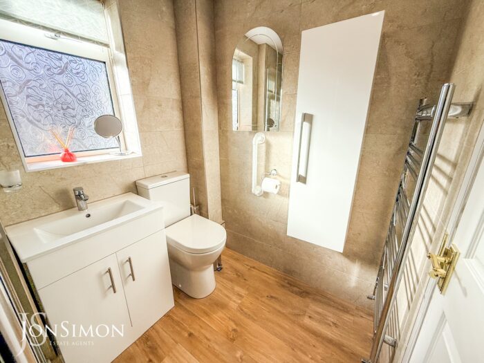 A modern three-piece white suite comprising of a large walk-in shower unit, WC, wash hand basin with storage cupboard underneath, wall mounted storage cupboard, chrome towel radiator, fully tiled walls, extractor unit, ceiling spotlights and UPVC double glazed side window.