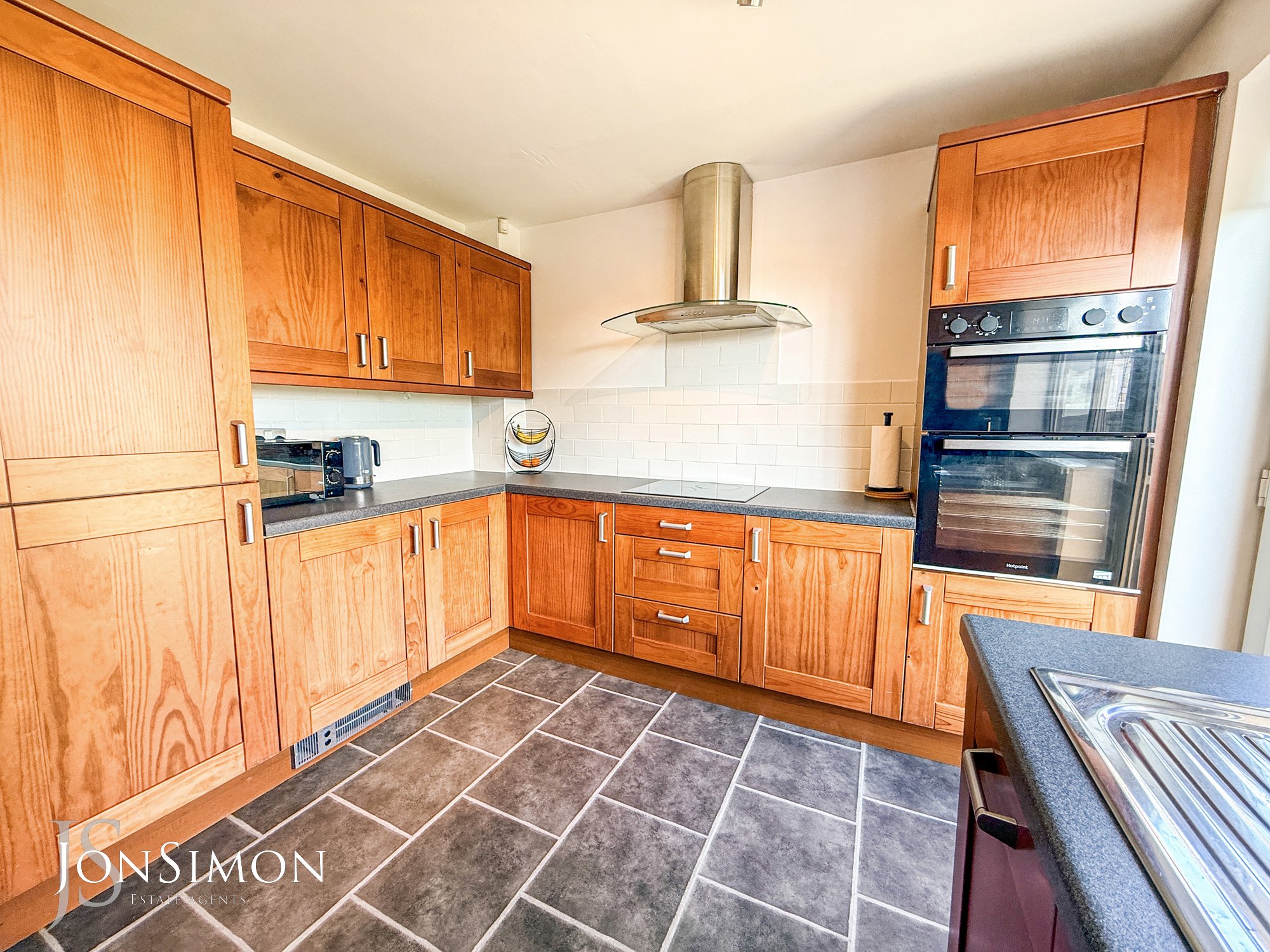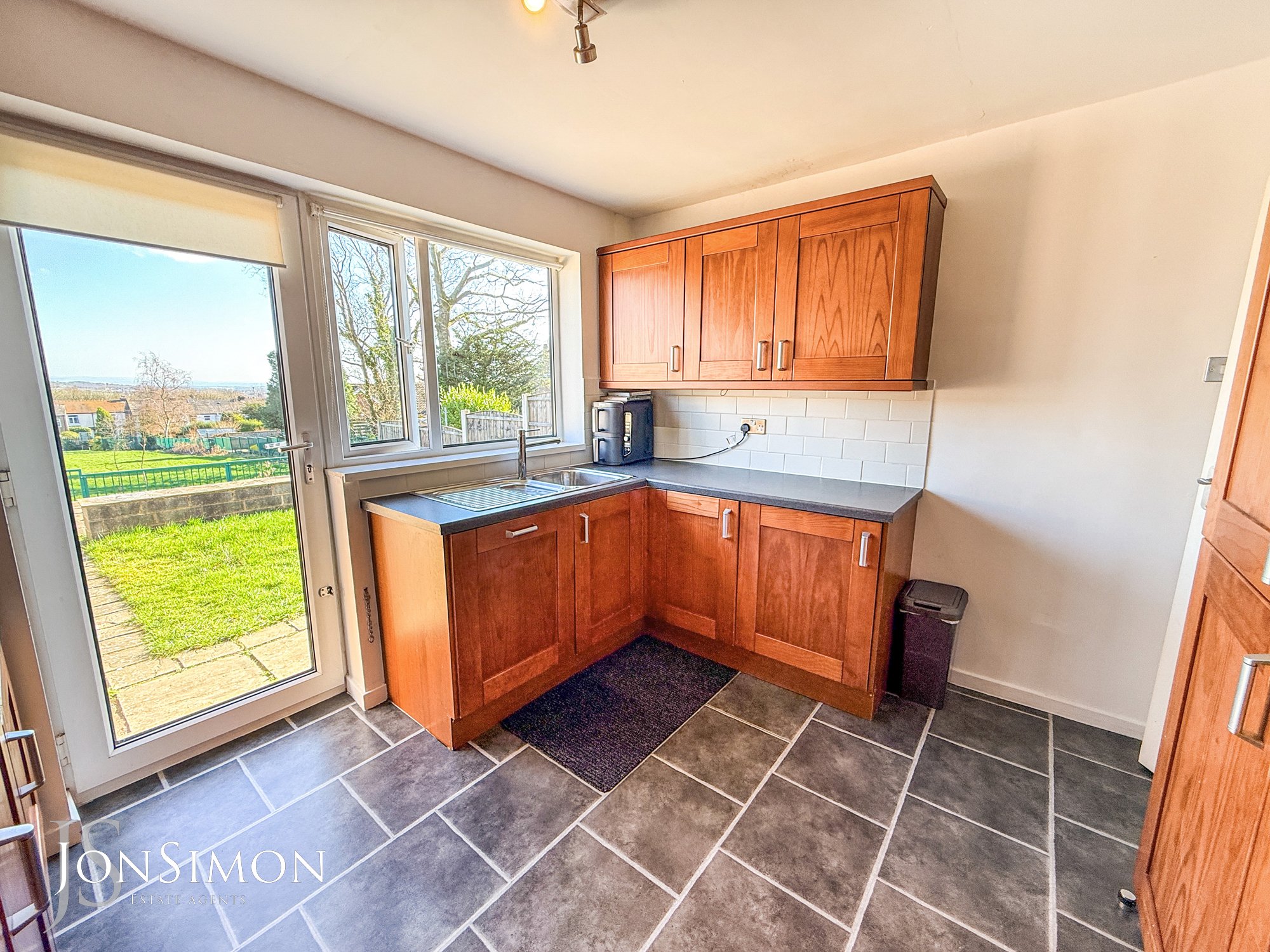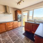 A modern range of wall units with complementary worksurface, single bowl sink unit with drainer, four ring gas hob with extractor unit above, electric oven, plumbed for washing machine, breakfast bar, radiator, part tiled walls, tiled flooring, ceiling points and double glazed rear window.