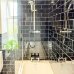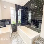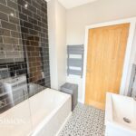 (2.26m x 1.75m) –With floor tile, part wall tile, recessed spotlights, extractor fan, and new suite of WC, basin, and bath with glass shower screen, waterfall shower head and handheld shower.