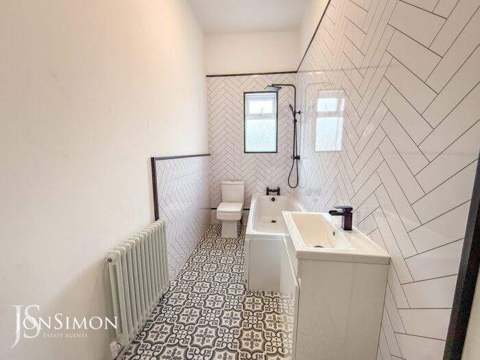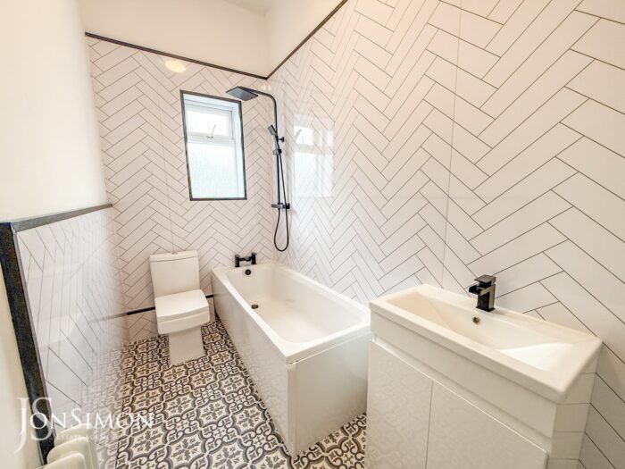 Modern three piece suite comprising: a low level w.c., pedestal hand wash basin and panelled bath with shower over. Radiator and upvc double glazed window to the rear.