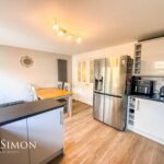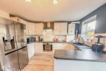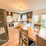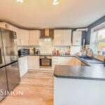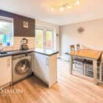 With a rear facing UPVC double glazed window and French doors leading out to rear garden, modern fitted kitchen with a range of wall and base units with contrasting work surfaces and splash back tiles, inset sink and drainer unit, built in electric oven, electric hob with extractor hood above, integrated dishwasher, plumbing for washing machine, laminate flooring, centre ceiling light and radiator.