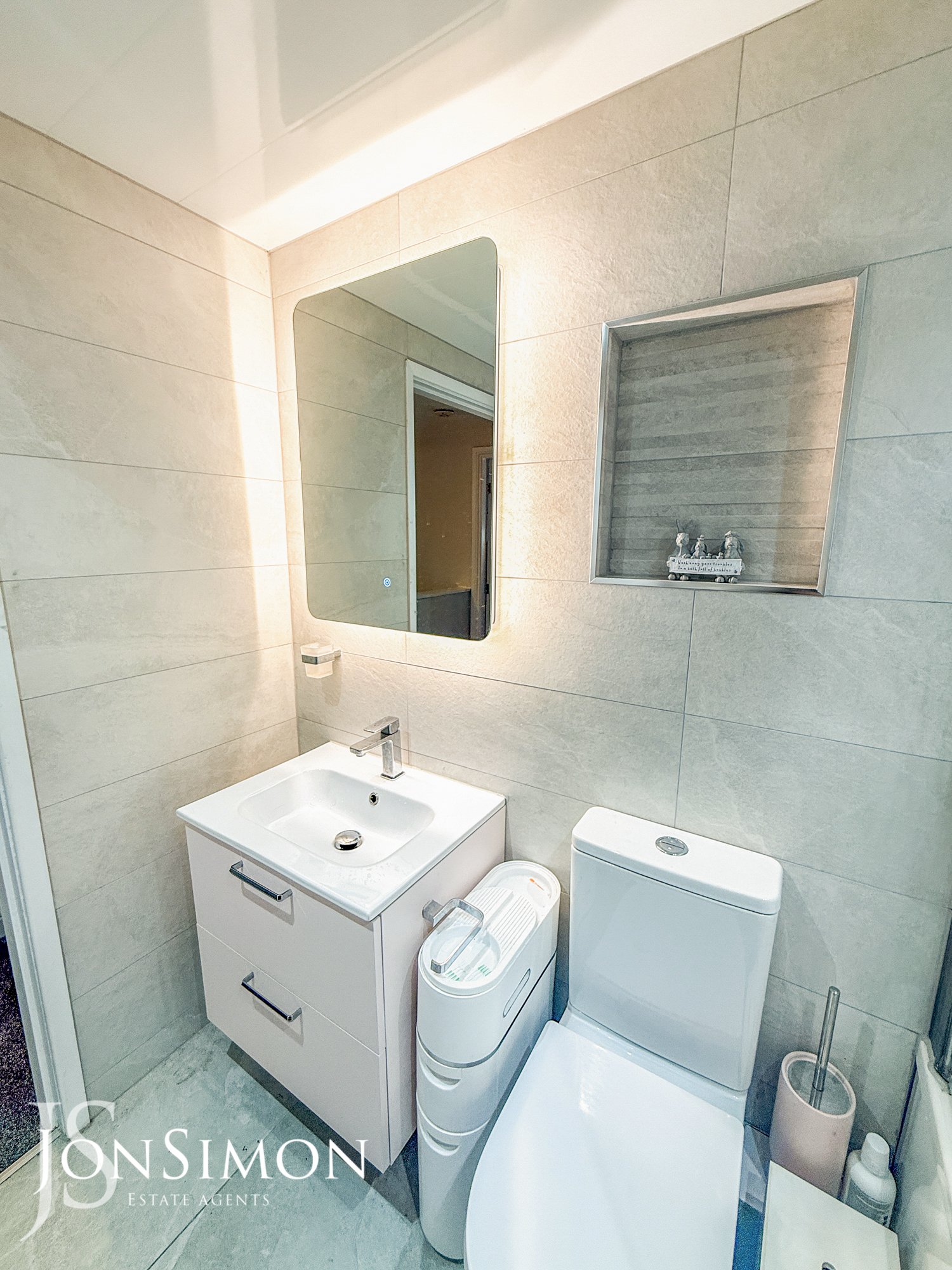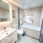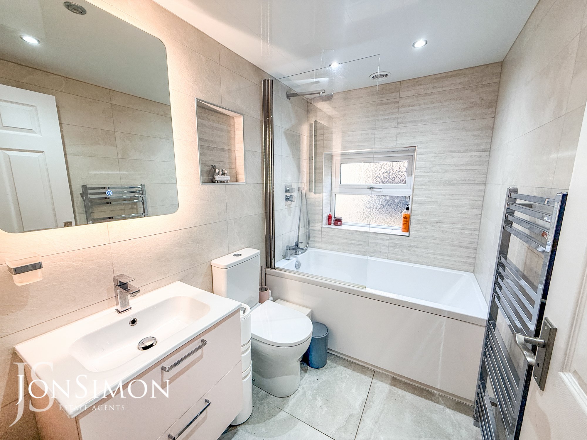 A stunning suite comprising of fully tiled walls and flooring, with a side facing opaque UPVC double glazed window, fitted with a three piece bathroom suite comprising of panel bath, low level WC and a hand wash basin, ceiling spot lights, towel radiator and extractor fan.