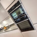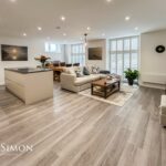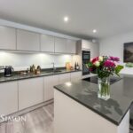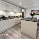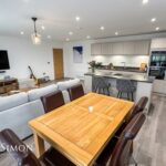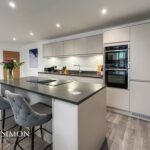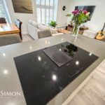 6.65m x 5.64m (21'10 x 18'6) - Two UPVC double glazed windows with maple plantation shutters, two electric heaters, range of light grey wall and base units with quartz surfaces and upstands, island with four ring induction hob with integrated extractor and pop up power sockets, double oven in a high rise unit, stainless steel inset sink with mixer tap, integrated fridge freezer and dishwasher, integrated washer/dryer, spotlights, extractor fan and Polyflor flooring.