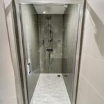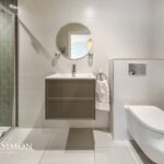 3.56m x 1.32m (11'8 x 4'4) - Electric thermostatic towel rail, low basin WC, wall mounted wash basin, direct feed shower unit, tiled elevations, spotlights, extractor fan and tiled flooring.