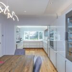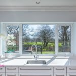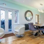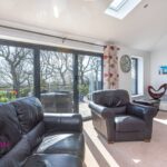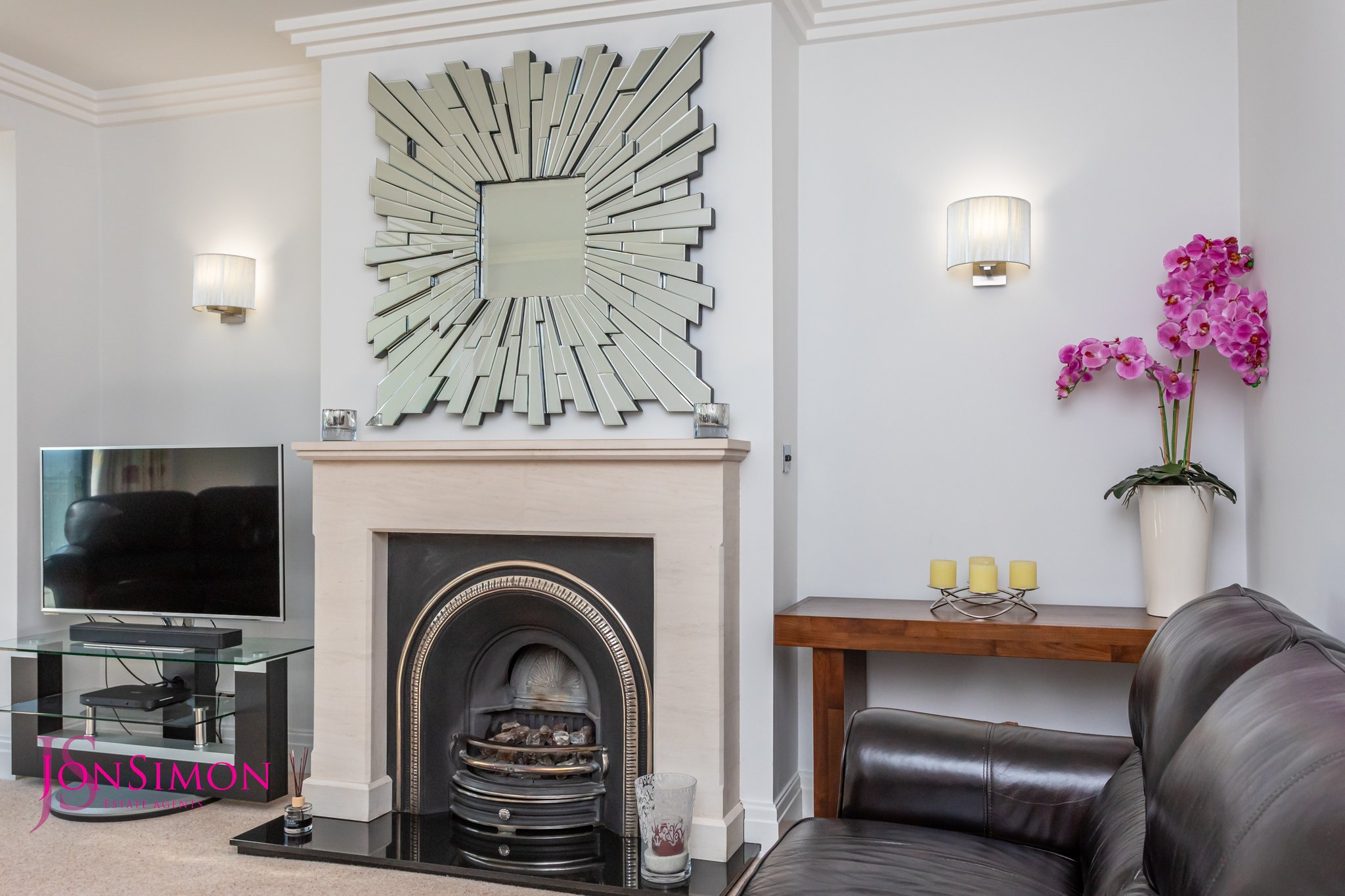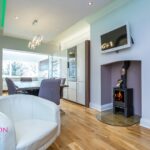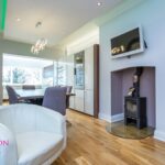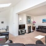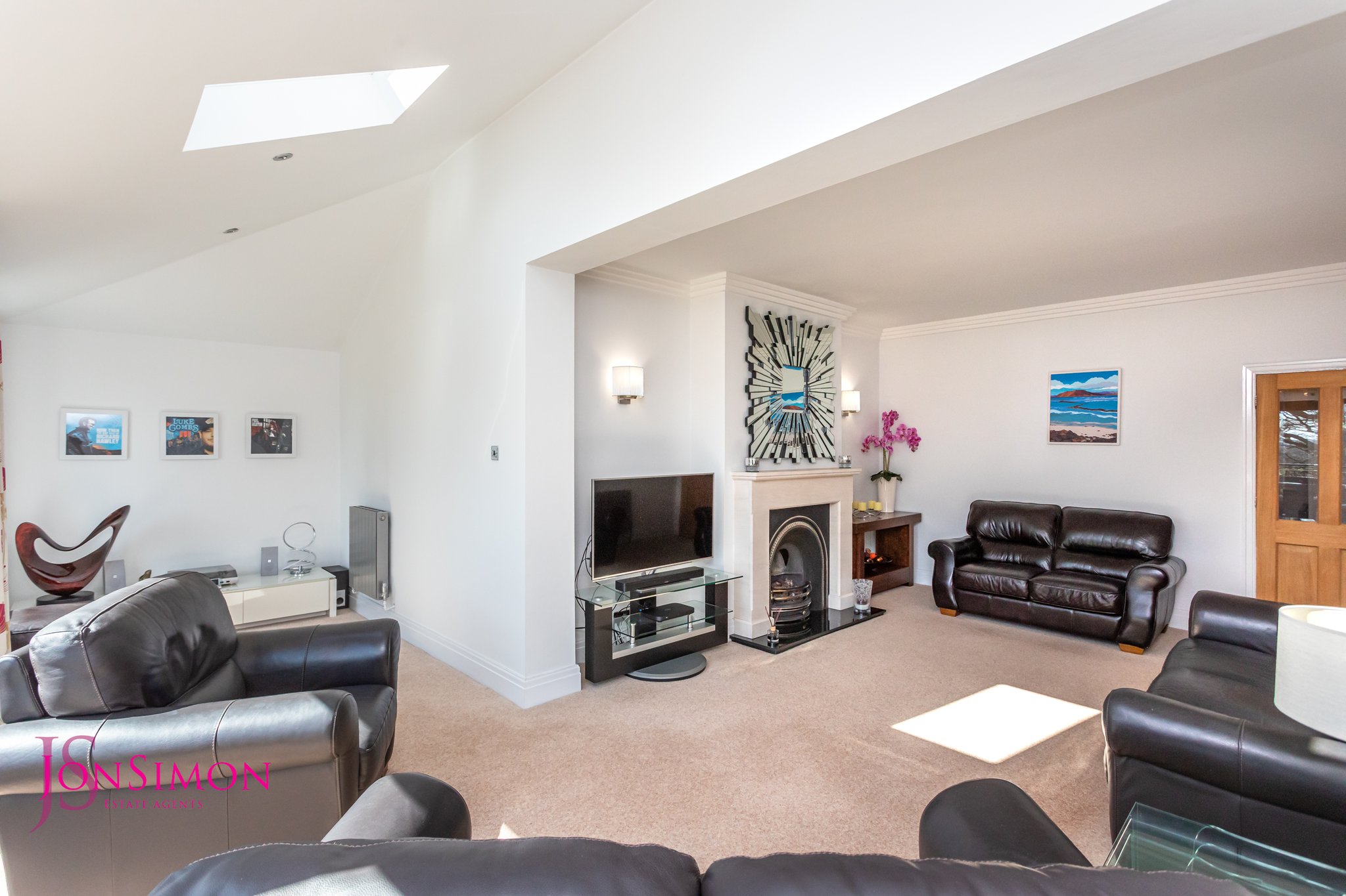 Triple glazed bi-folding aluminium patio doors, aluminium triple glazed rear window, feature coal effect gas fire with feature surround, wall lights, ceiling coving, ceiling spotlights and two Velux double glazed rear windows.