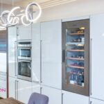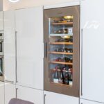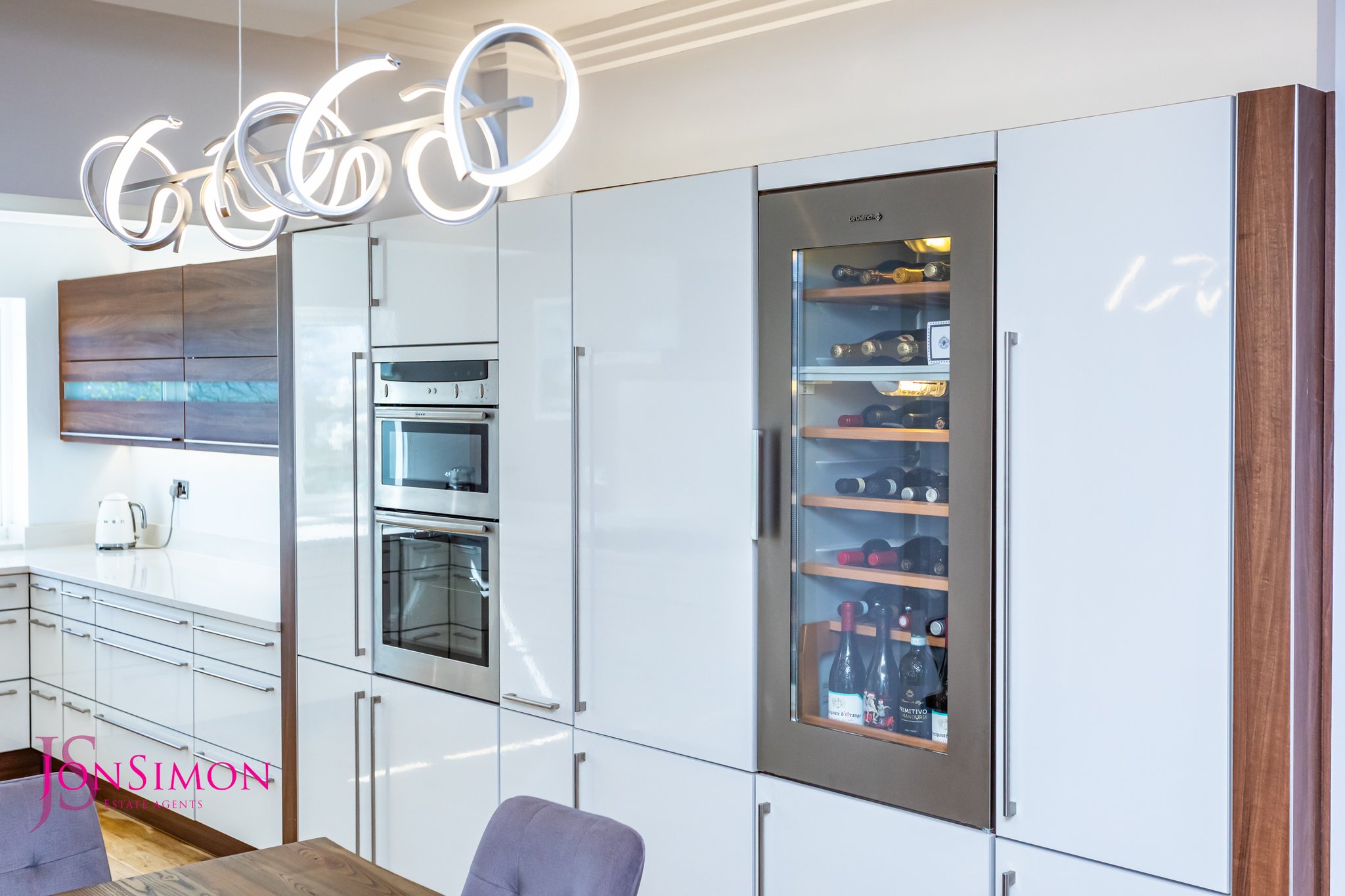 A superb modern fitted kitchen with a large range of wall and base units with complementary work surfaces, single bowl sink unit with mixer tap, five ring gas hob with extractor unit above, integrated fridge, freezer, dishwasher, double electric oven, wine fridge, radiators, feature log burning stove, solid flooring, feature lighting, ceiling spotlights, ceiling bluetooth speakers, coving, ceiling points, UPVC double glazed rear window and UPVC French patio doors.
