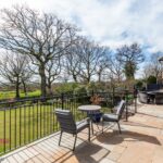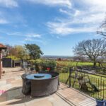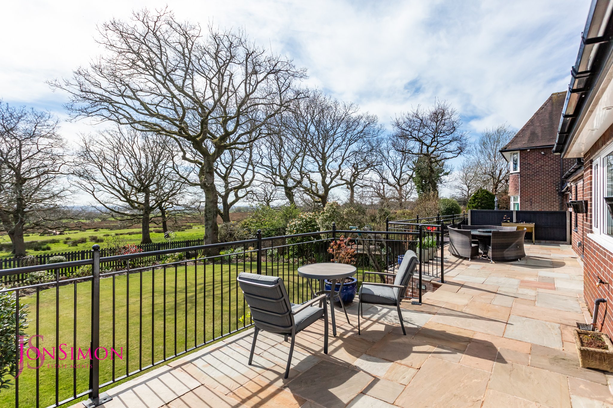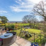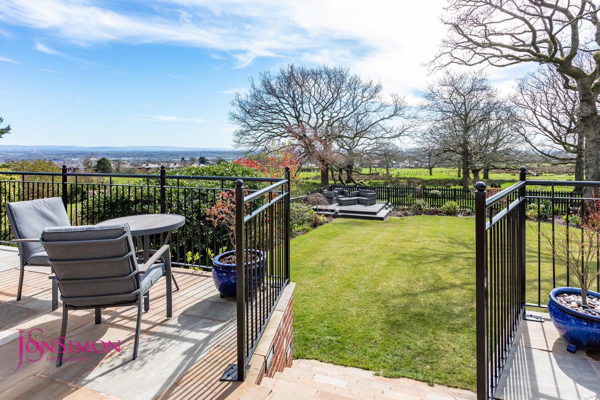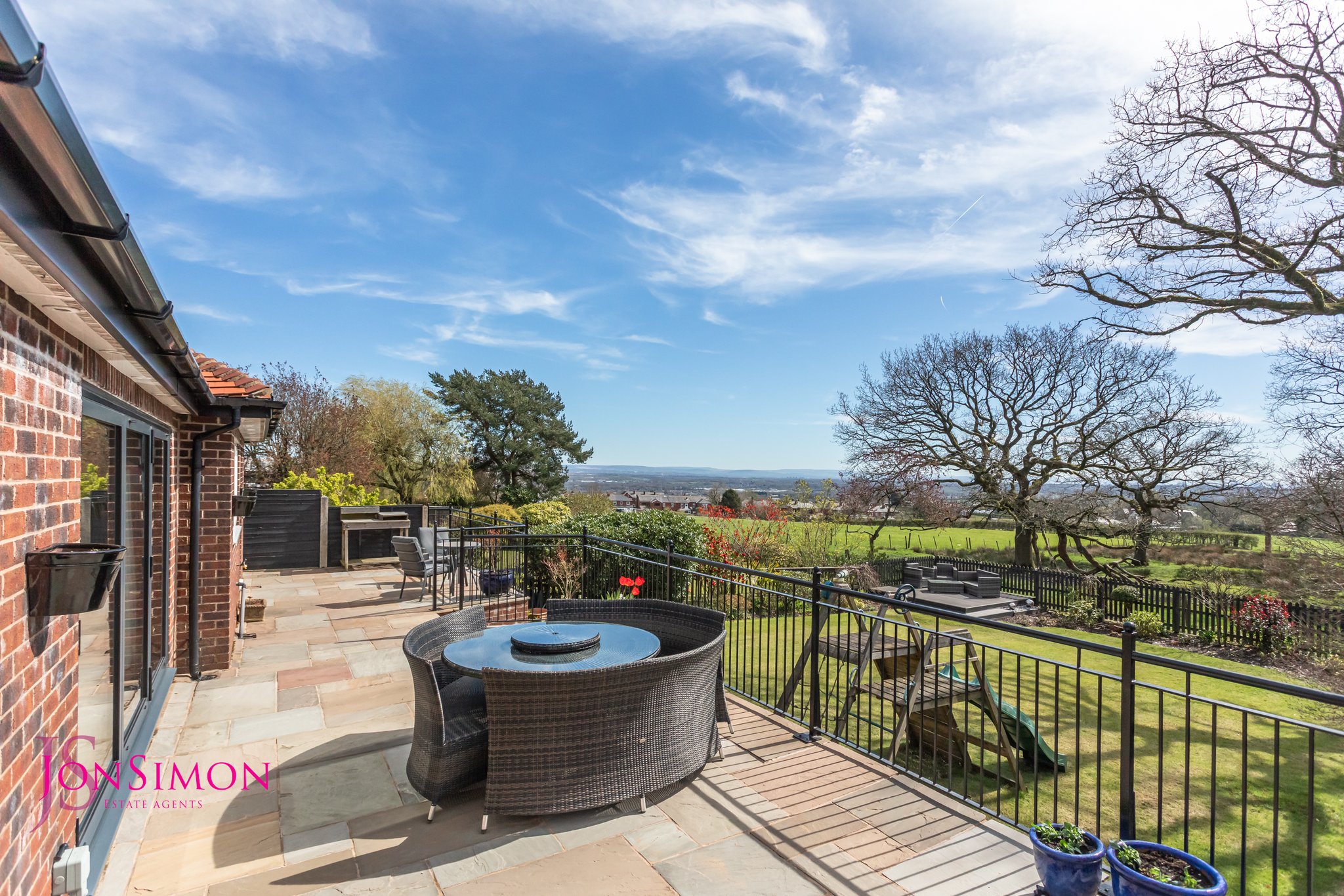 Rear: A large paved patio area with steps leading down to the well maintained lawn, well maintained borders and shrubs, additional composite decked patio area, outside water tap, external plug sockets, external lighting, stunning rear southerly views over farmland and beyond.