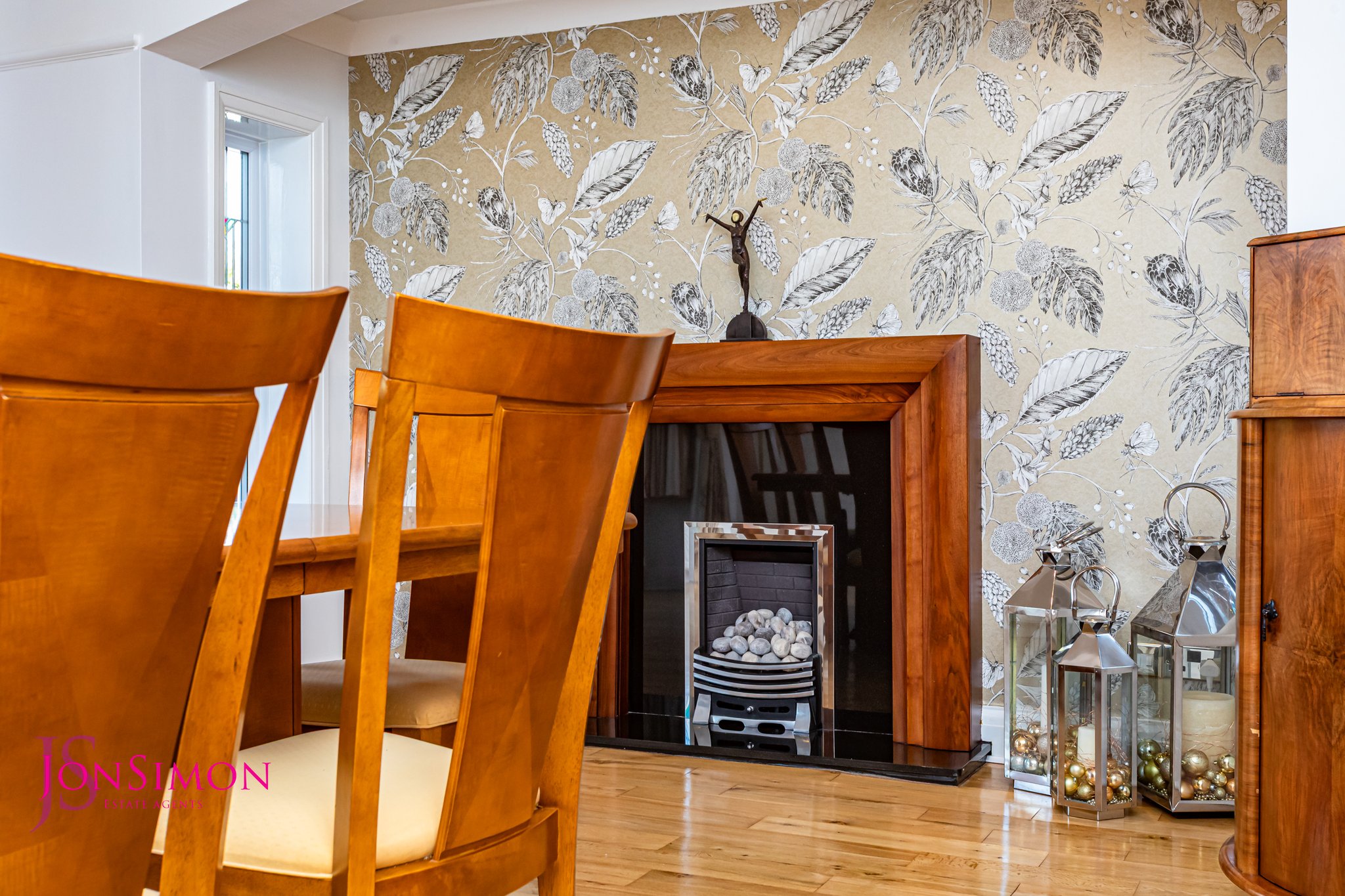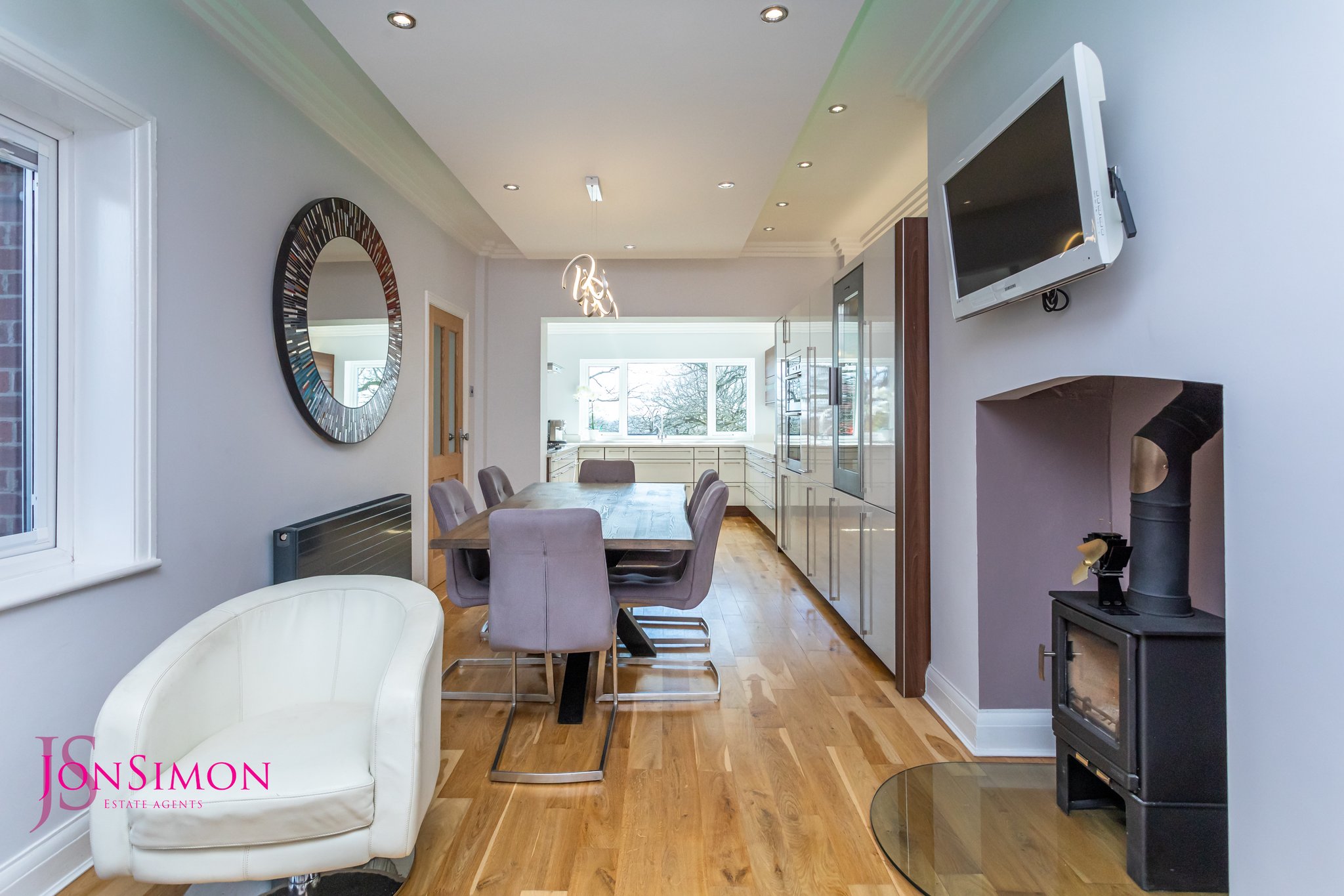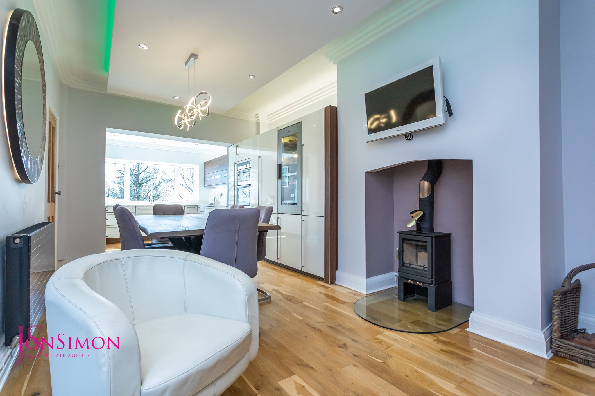 The ground floor briefly comprises an entrance porch opening into an impressive reception hallway, a spacious lounge featuring a striking fireplace and bi-fold doors leading out to the rear garden, and a formal dining room with a beautiful bay window incorporating stained glass detailing and a charming feature nook with fireplace. The heart of the home is the stunning open-plan dining kitchen and family room, complete with a feature log-burning stove. A separate utility room and a contemporary ground floor shower room complete the accommodation.