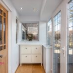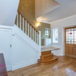 Feature stain glass windows and door, radiators, ceiling coving, wall lights, electric meter cupboard, under the stairs storage cupboard and staircase leading to the first floor landing.