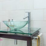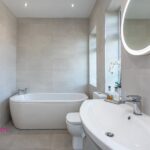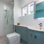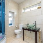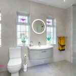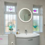 A modern three-piece suite comprising of a large walk-in shower unit, low level WC, wash hand basin with storage cupboards underneath, chrome towel radiator, part tiled walls, tiled flooring, extractor unit, underfloor electric heating, ceiling spotlights, wall mounted mirror and UPVC double glazed stained glass front window.