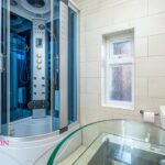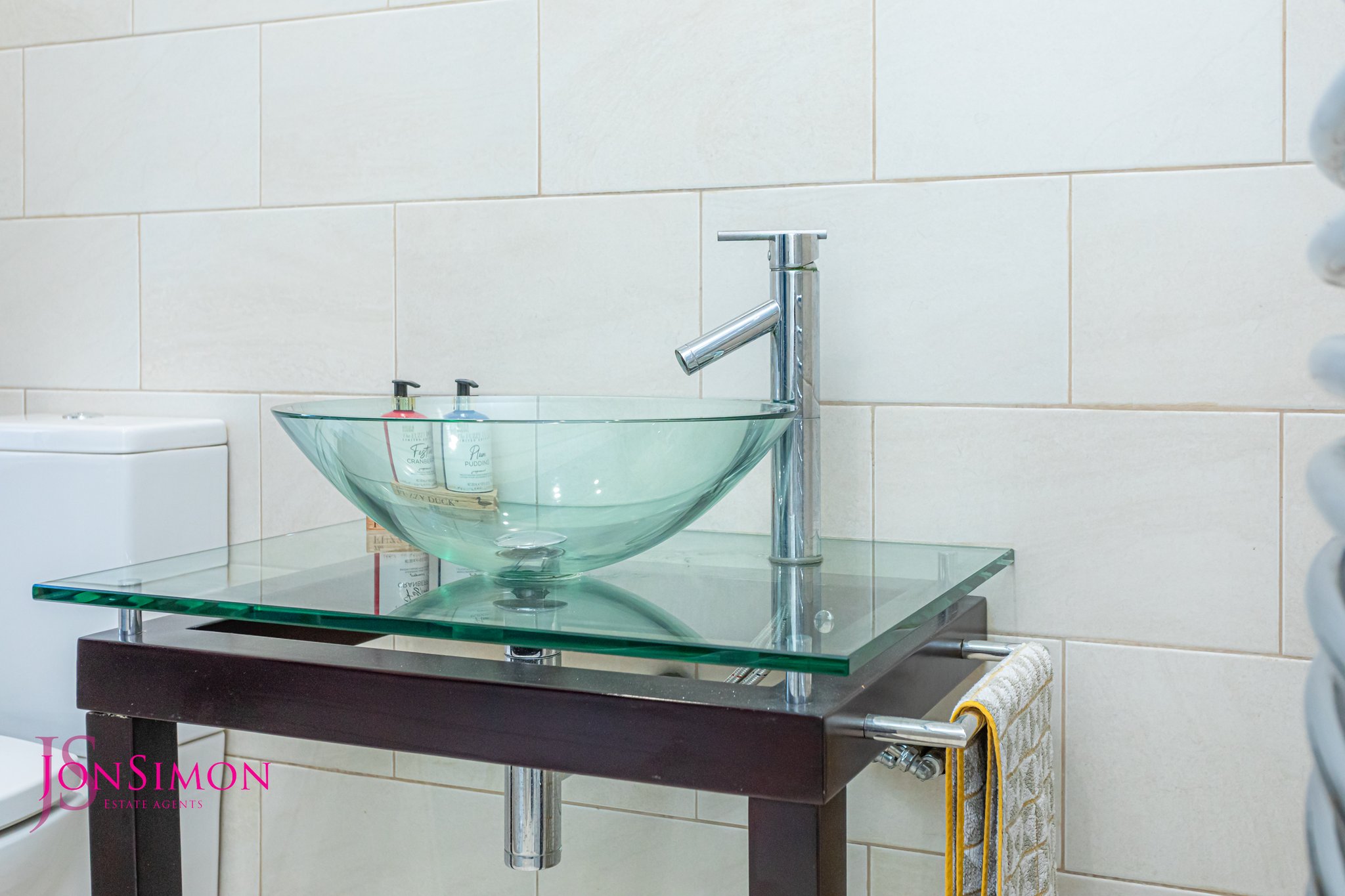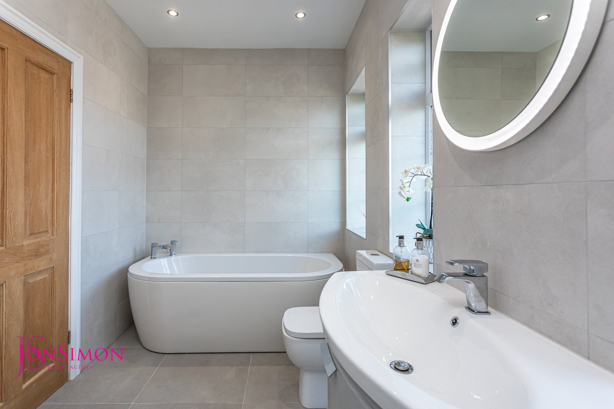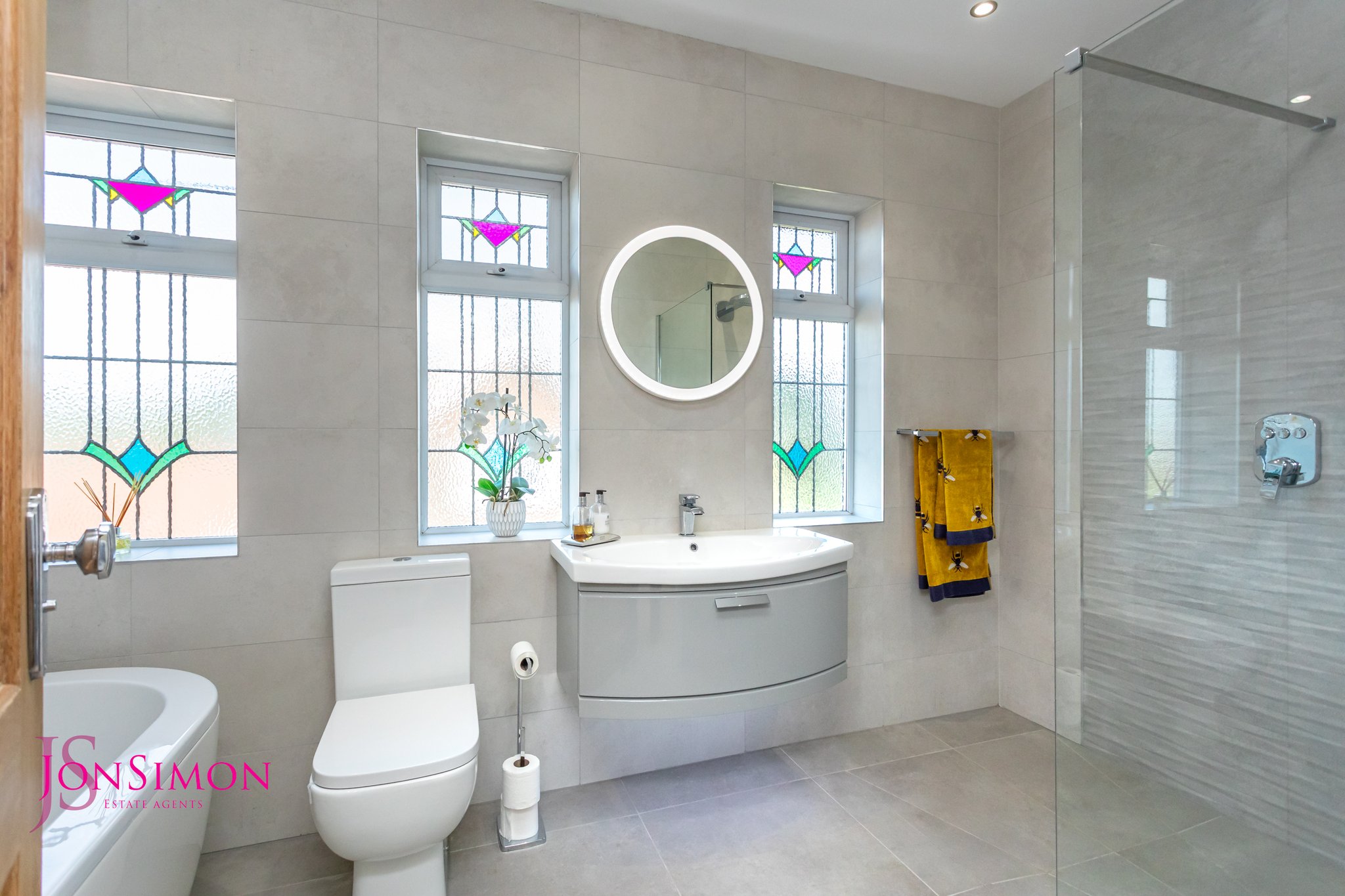 A superb four piece suite comprising of a panel bath with mixer tap, large walk-in shower unit, low level WC, wash hand basin with storage drawer underneath, underfloor electric heating, chrome towel radiator, wall mounted mirror, fully tiled walls and flooring, ceiling spotlights and three UPVC double glazed stained glass windows.