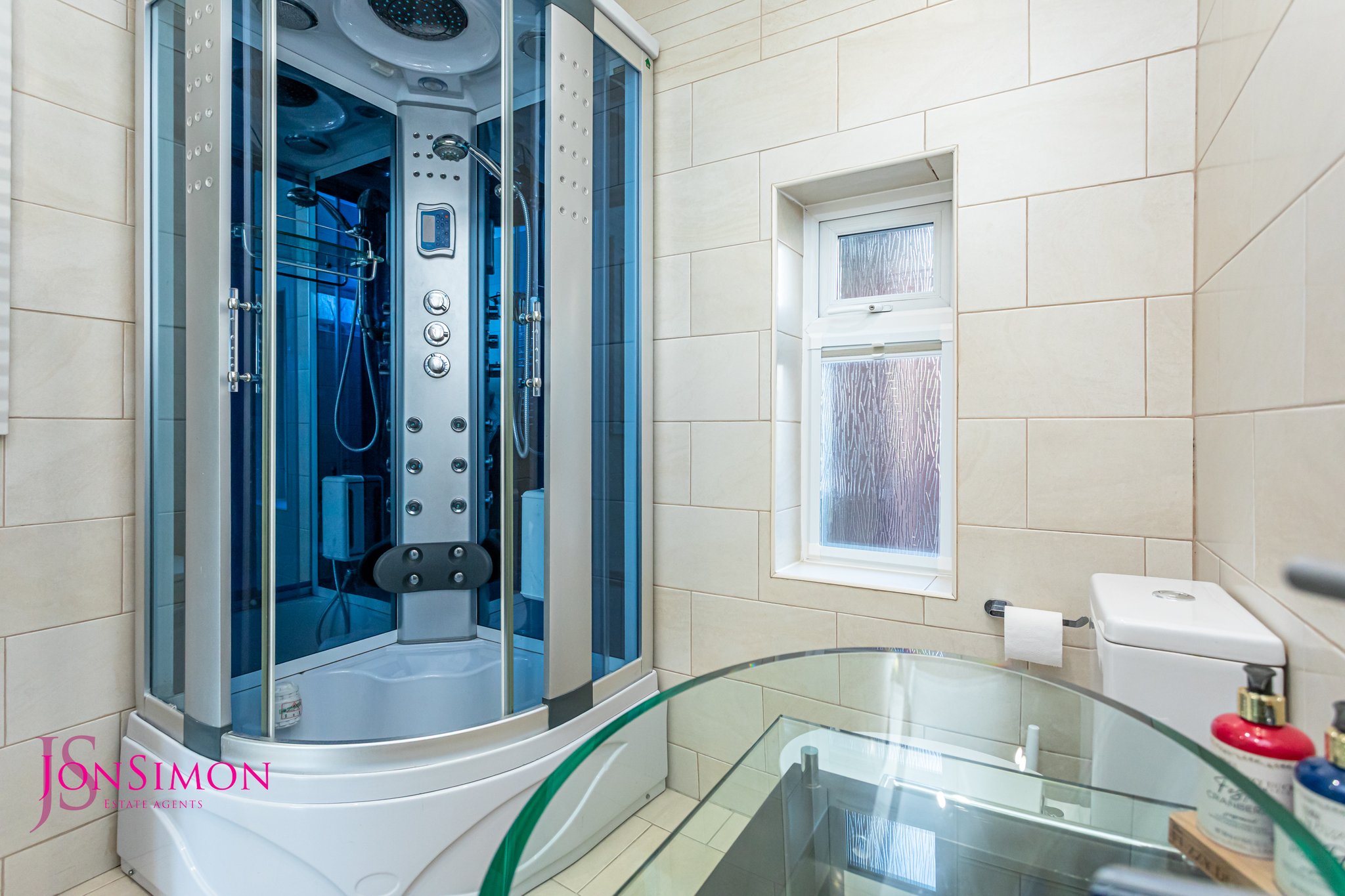 A modern three-piece white suite comprising of a walk-in shower unit with body jets and speakers, low level WC, wash hand basin, chrome towel radiator, ceiling spotlights, tiled walls and flooring, UPVC double glazed side and front window.