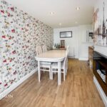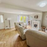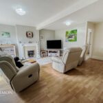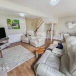 UPVC double glazed French patio doors and windows, a modern gas fire with fireplace surround, radiator, laminate floor, ceiling points, TV point, under stairs cupboard, stairs leading to the first floor landing.