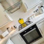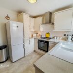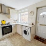 Modern fully fitted kitchen with a range of wall and base units with complementary worksurface, 1 1/2 bowl sink unit with drainer, four ring gas hob with extractor unit above, electric oven, plumbed for washing machine, tiled walls, ceiling point, UPVC double glazed front window and UPVC double glazed front door.